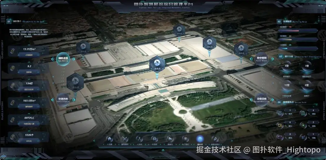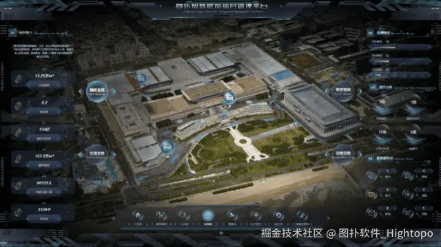 图扑智慧展馆解决方案通过倾斜摄影技术勾勒精准数据模型,多维动态展示展馆外景实时数据,支持接入多源异构数据。一站式呈现全馆运营态势,智能预测趋势,快速响应突发状况。