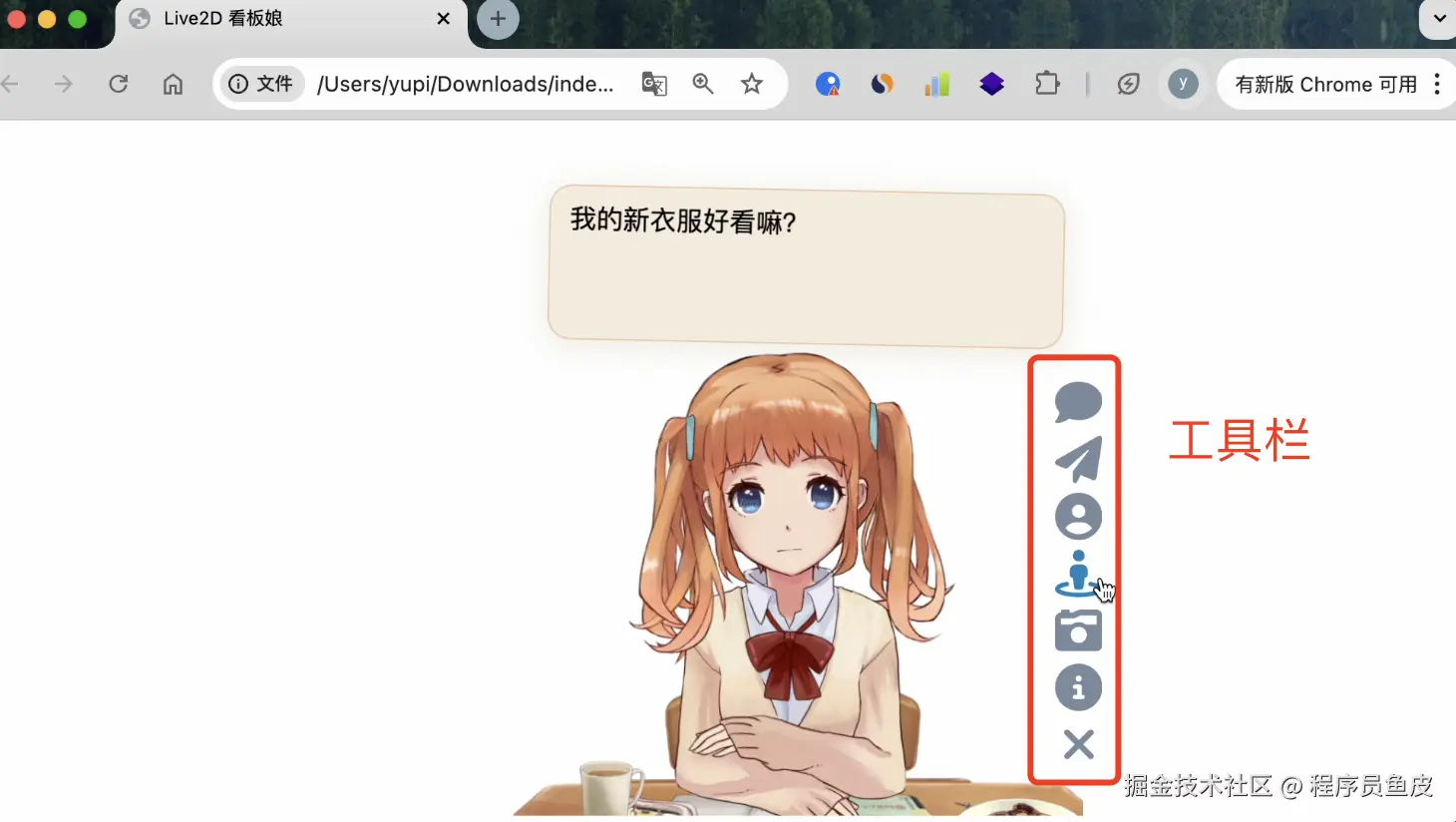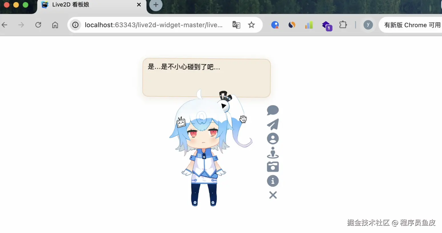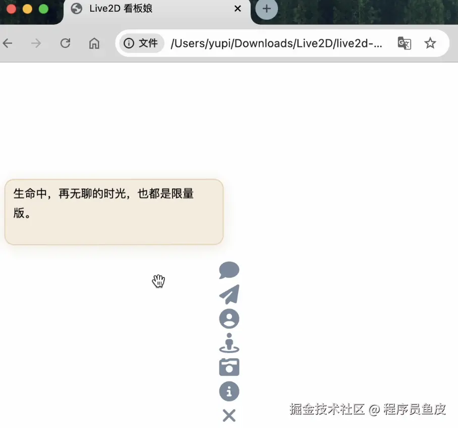 来,运行网页看下效果,看板娘直接就出来了有没有!还支持对话、换模型、换衣服、截图功能: