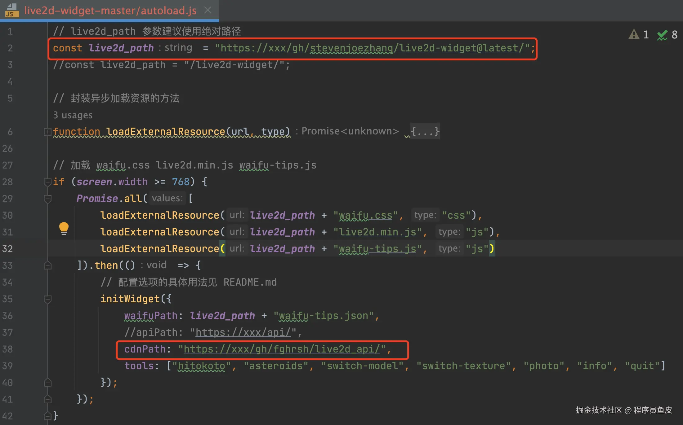 最后,修改 autoload.js 加载文件的配置,包括将 live2d 路径改为当前路径,修改初始化组件配置为本地(使用本地模型、指定模型文件路径、模型列表配置文件的路径),还可以自定义要使用的工具: