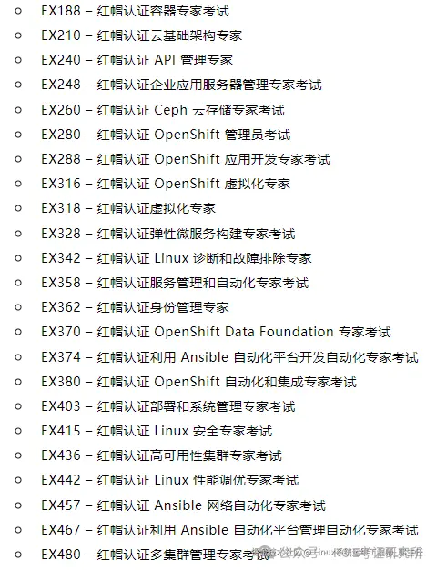 - 红帽认证架构师(RHCA): 是红帽认证体系中的高级证书,涉及多个领域的知识,通常需要先获得RHCE认证。