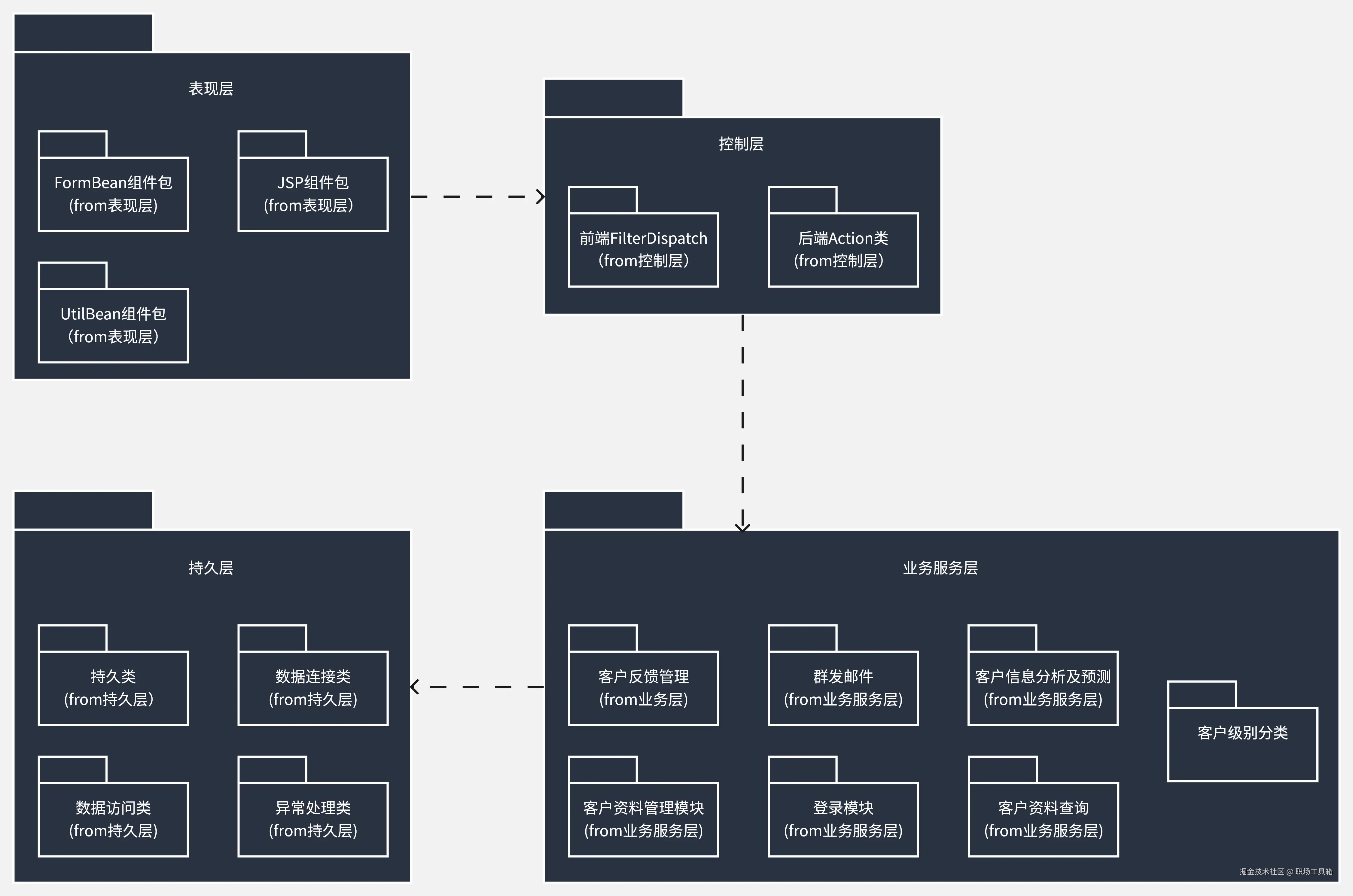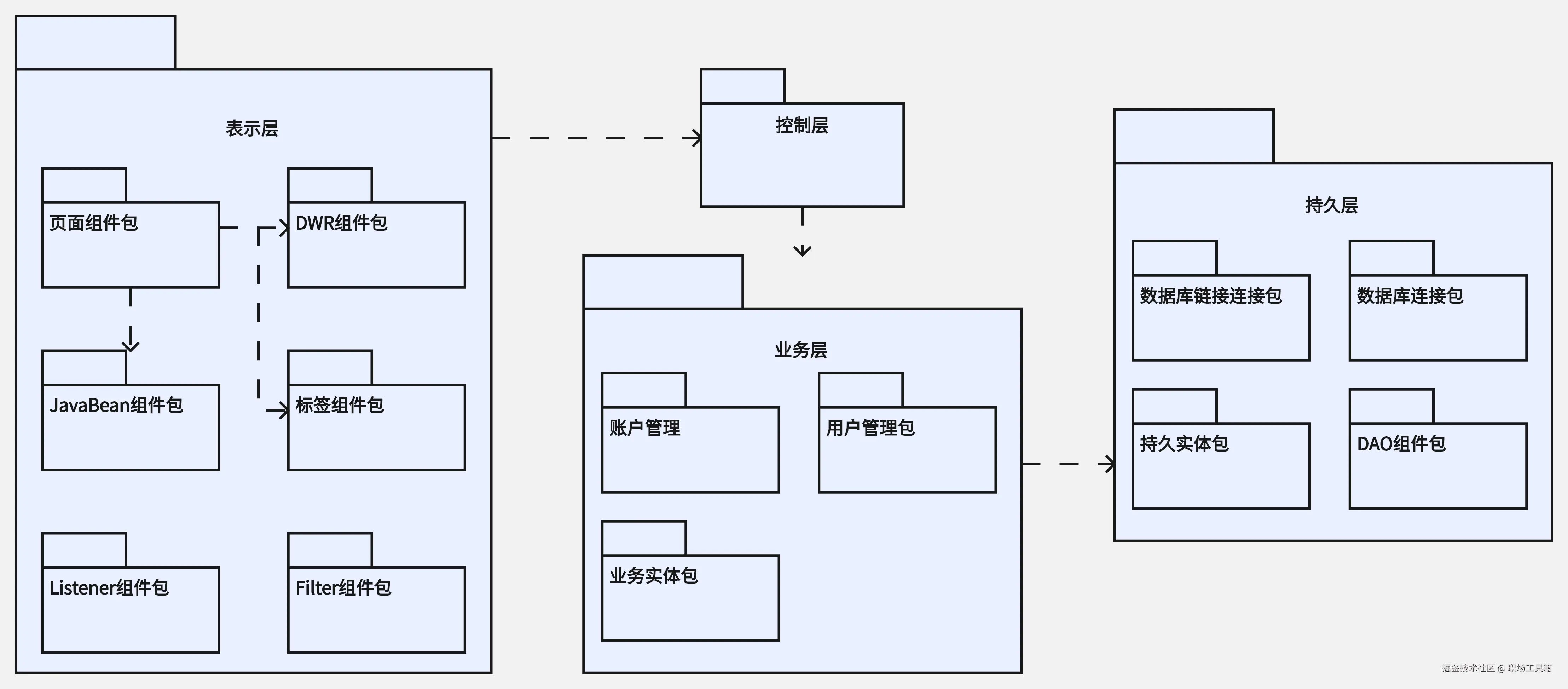UML图包含的图形种类有很多,UML包图(Package Diagram)是UML图的一种,用于显示系统在包层面的组织结构,展示包与包之间的依赖关系。