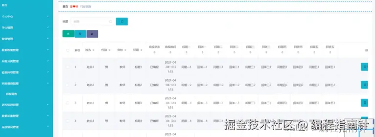 问卷调查管理:通过列表可以获取姓名、性别、身份、标题、填报状态、填报时间、问题等信息,进行查看修改或删除操作,如同3-6所示。