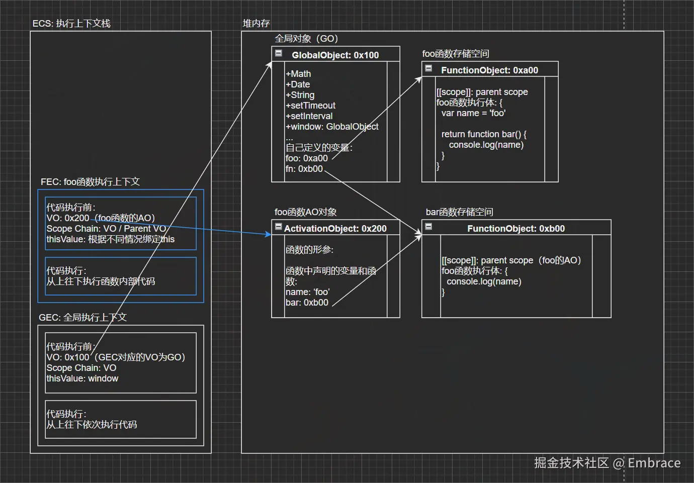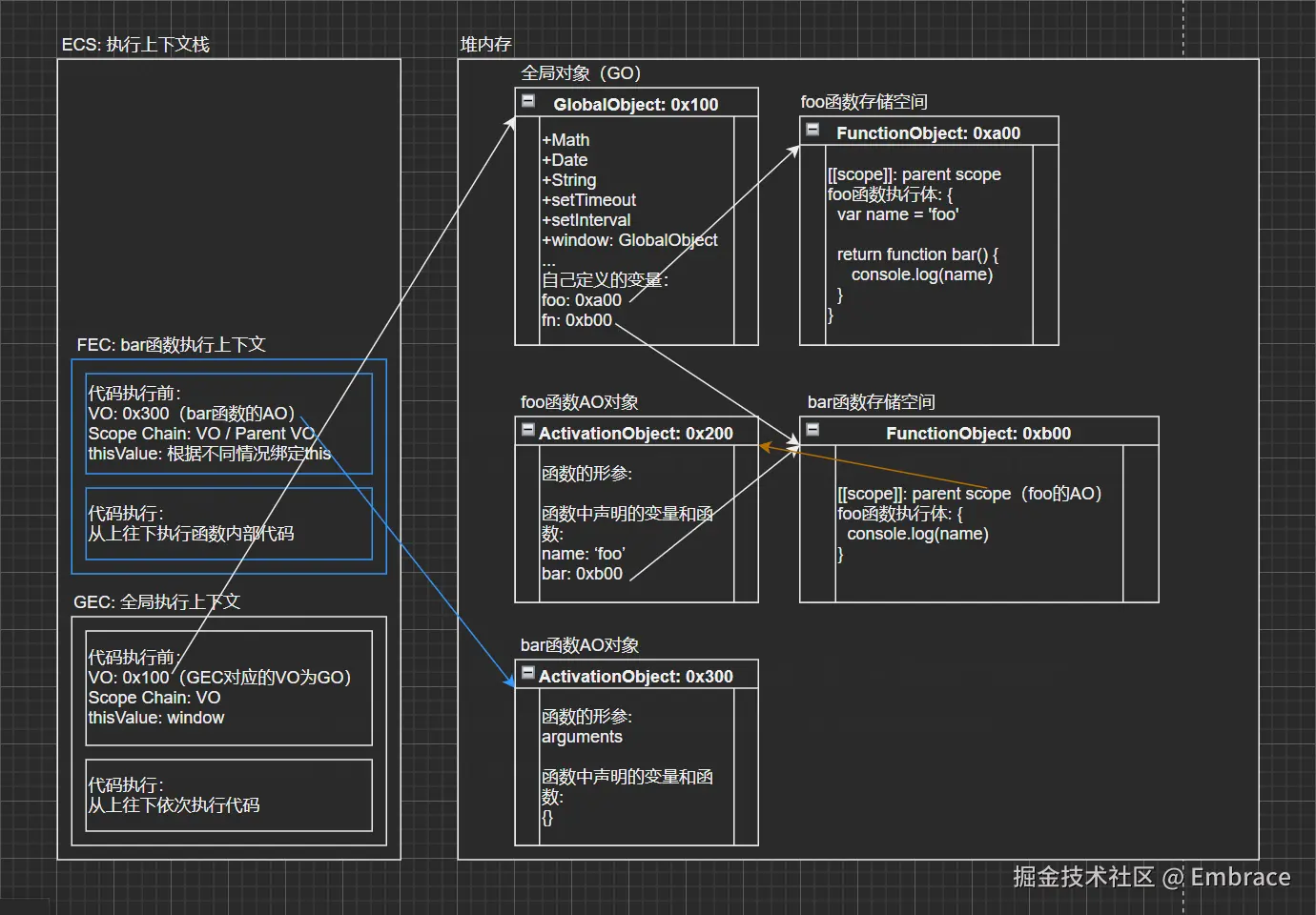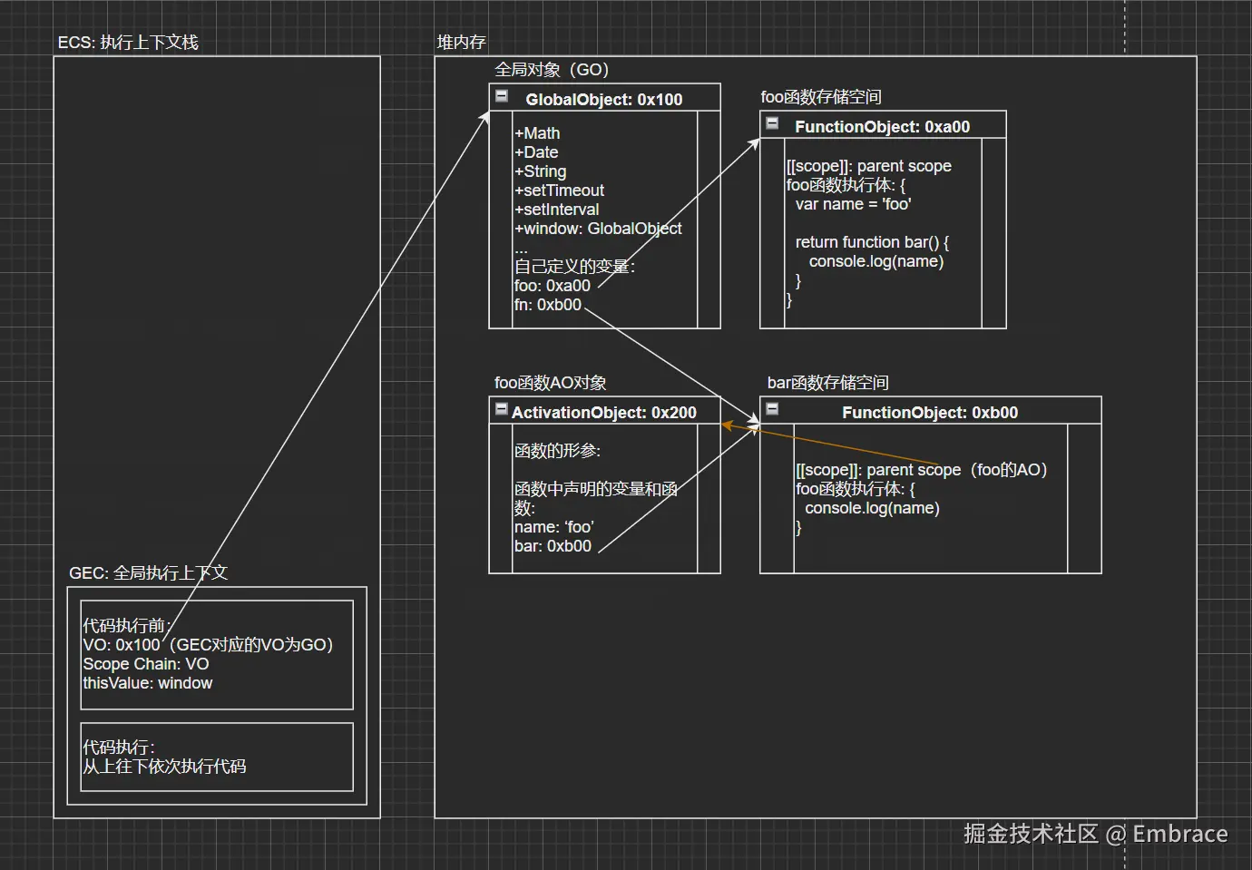 bar函数执行完成后,bar函数的执行上下文弹出栈,对应bar的活跃对象(AO)被销毁,而foo的活跃对象(AO)还一直存留在内存中;