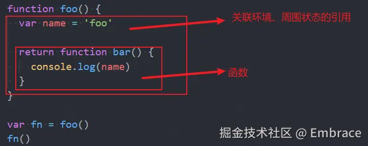 function foo() { var name = 'foo' return function bar() { console.log(name) } } var fn = foo() fn() -