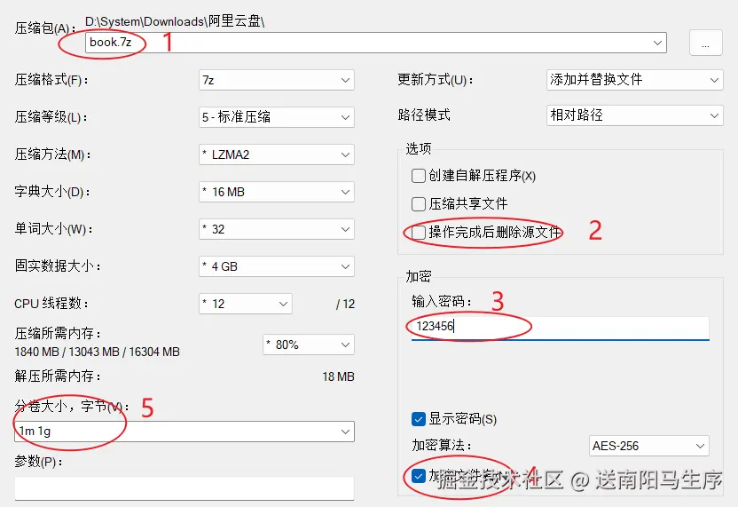 在第(5)处填写 “1m 1g”,表示压缩的第一卷大小 1MB,剩余的卷大小为 1GB。 压缩时不能存在同名目标文件。 即目标压缩文件名为 book.7z 的分卷压缩中,当前目标下不能存在名为 book.7z.001 的文件