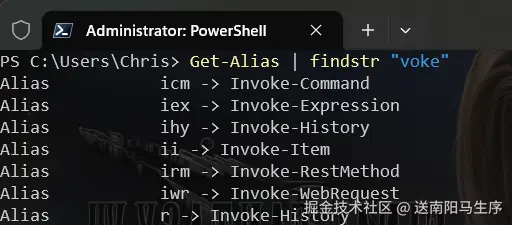 3)查看命令的别名:Get-Alias。(比较多时配合 findstr 命令更好看):