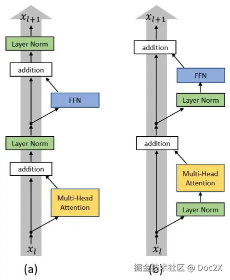图1。(a)Post-LN Transformer层;(b)Pre-LN Transformer层。