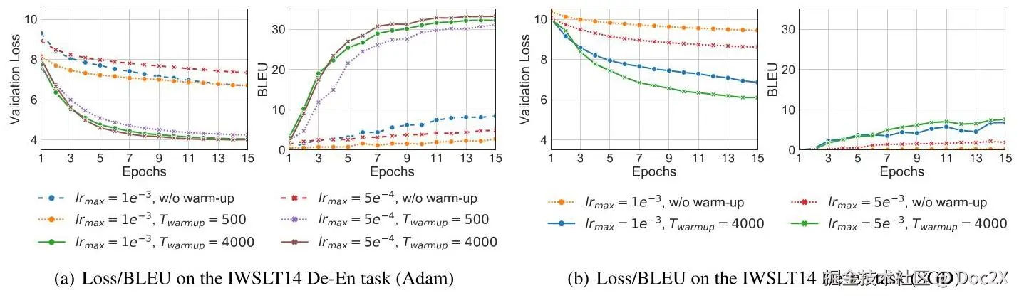 实验设置 我们在IWSLT14德语到英语(De-En)的机器翻译任务上进行实验。我们主要研究两个方面:学习率预热阶段是否必要,以及最终模型性能是否对 的值敏感。为了研究第一个方面,我们分别使用Adam优化器(Kingma & Ba, 2014)和普通的SGD优化器(Ruder, 2016)来训练模型。对于这两种优化器,我们检查是否可以移除预热阶段。我们遵循Vaswani等人(2017)的方法,将超参数 设置为(0.9,0.98)用于Adam。我们还测试了不同的 对两种优化器的影响。对于Adam,我们设置 或 ,而对于SGD,我们设置 或 。当使用预热阶段时,我们按照原始论文(Vaswani等人, 2017)的建议设置 。为了研究第二个方面,我们设置 为1/500/4000("1" 指无预热设置),并使用 或 与Adam配合。对于所有实验,在预热阶段之后使用相同的逆平方根学习率调度器。我们使用验证损失和BLEU(Papineni等人, 2002)作为模型性能的评估指标。