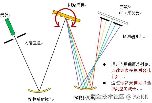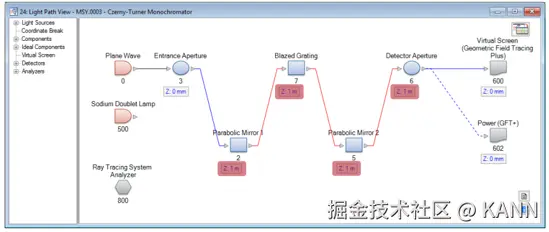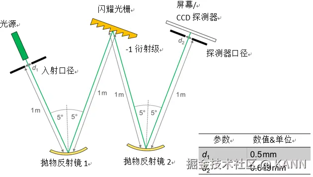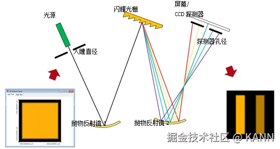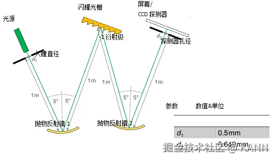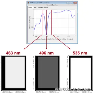 测量系统(MSY.0003 v1.1) 应用示例简述 1.系统说明 光源— 平面波(单色)用作参考光源— 钠灯(具有钠的双重特性) 组件— 光阑(狭缝),抛物面反射镜,闪耀光栅 探测器— 功率— 视觉评估 建模/设计— 光线追迹:初始系统概览— 几何场追迹+(GFT+): 窄带单色仪系统的仿真 为分辨特定光谱曲线进行整个光谱的高分辨率分析 2.系统说明 3.系统参数 4.建模/设计结果 总结 模拟并分析了Czerny-Turner单色仪及并将其用于光谱研究中。1. 仿真以光线追迹对单色仪核校。2. 研究应用经典场追迹和几何场追迹+引擎对系统的性能进行研究。系统分析中包括采用傅里叶模态法进行光栅效率的严格分析。3. 应用应用真实的Czerny-Turner单色仪分辨了钠灯的双波长特性可以通过使用VirtualLab对复杂的光谱系统,比如Czerny-Turner进行详尽的研究。 应用示例详细内容****系统参数 1. 仿真任务:Czerny-Turner干涉仪Czerny-Turner干涉仪是一种广泛用于光和样本的光谱研究。主要由两个球面或抛物面反射镜、两个光阑以及一个作为分光元件的光栅组成。 2. 系统参数 元件在1m范围内的距离与非常窄的入瞳孔径进行结合以确保单色仪/光谱仪的高光谱分辨率。 3. 说明:平面波(参考) 采用单色平面光源用于计算和测试。 4. 说明:双线钠灯光源 为了增强光谱仪的光谱分辨率,对钠灯的双波长特性进行研究。 双波长通过旋转轨道的相互作用分离,表现为具有515GHz频率差异(波长差为0.6nm)。 由于低气压灯的扩展发射区域,钠灯可视为平面波。 5. 说明:抛物反射镜 利用抛物面反射镜以避免球差。 出于此目的,在VirtualLab库目录中选择离轴抛物面反射镜(楔形)组件。 6. 说明:闪耀光栅 采用衍射元件用于分离所研究光源的光谱波长。 通过使用闪耀光栅,可以对期望衍射级次的衍射效率进行优化 7. Czerny-Turner 测量原理 通过光栅倾斜角的变化,入瞳的像可经过探测器孔径进行扫描。探测器可以评估光入射的能量。 8. 光栅衍射效率 VirtualLab的光栅组件可通过傅里叶模态法(FMM)对衍射级次进行严格的计算。 因此,每一个波长的效率可视为独立的。 3个不同波长的不用的衍射效率的归一化强度:(可被测量系统的计算视为如此) file used: MSY.0003_Czerny-Turner_Mono_01_Diffraction_Efficiency.lpd 9. Czerny-Turner系统的光路图设置 由于VirtualLab的相对位置系统,只设置了沿Z轴方向的距离。 10. Czerny-Turner 系统的3D视图 增大平面波光源和孔径的距离仅是为了更清晰的显示3D视图(可在光路编辑器中实现)。 不仅如此,距离减到0.1倍是为了提高视图的可观察性。 应用示例详细内容 仿真&结果 1. 结果:利用光线追迹分析 首先,利用光线追迹分析光在光学系统中的传播。 对于该分析,采用内嵌的光线追迹系统分析器。 file used: MSY.0003_Czerny-Turner_Mono_02_RT.lpd 2. 结果:通过虚拟屏的扫描 通过将光栅倾斜合适的角度以选择被探测的波长 (可通过光栅方程计算该角度)。 采用VirtualLab中的参数耦合功能连接波长和光栅的倾斜角度, 通过该功能给定波长,可以自动设置合适的倾斜角。因此,如为了仿真全谱段,参数运行必须指定波长。 animation: MSY.0003_Czerny-Turner_Mono_03_VIS_Scan.bms 3. 衍射效率的评估为选择合适的仿真引擎,必须考虑孔径衍射效应的影响。 比较经典场追迹和几何场追迹+可知,由于两者的差别较小,可忽略衍射效应。采用更快速的GFT+引擎用于后续研究。file used: MSY.0003_Czerny-Turner_Mono_03_Diffraction_Effects.lpd 4. 结果:衍射级次的重叠 因为光栅用于分离多谱段(如可见光),所以不同衍射级次可能发生重叠。 VirtualLab的光栅组件可以计算所有期望的衍射级次(包括利用傅里叶模态法计算衍射效率)。 0级衍射并不分散,但2级衍射相对于1级衍射表现出较大的发散角。 通过光栅参数和光栅方程的计算可发现重叠为760nm(1级)和380nm(2级) 光栅方程: **5. 结果:光谱分辨率 **file used: MSY.0003_Czerny-Turner_Mono_06_Resolution.run 6. 结果:分辨钠的双波段 应用所建立单色仪分辨钠的双波段特性。 设置的光谱仪可以分辨双波长。 file used: MSY.0003_Czerny-Turner_Mono_07_Sodium.run 7. 总结模拟并分析了Czerny-Turner单色仪及并将其用于光谱研究中。1. 仿真以光线追迹对单色仪核校。2. 研究应用经典场追迹和几何场追迹+引擎对系统的性能进行研究。系统分析中包括采用傅里叶模态法进行光栅效率的严格分析。3. 应用应用真实的Czerny-Turner单色仪分辨了钠灯的双波长特性可以通过使用VirtualLab对复杂的光谱系统,比如Czerny-Turner进行详尽的研究。 扩展阅读1. 扩展阅读以下文件给出了在VirtualLab中如何设置测量系统的更多细节。 开始视频- 光路图介绍- 参数运行介绍- 参数优化介绍 其他测量系统示例:- 马赫泽德干涉仪(MSY.0001)- 迈克尔逊干涉仪(MSY.0002) |