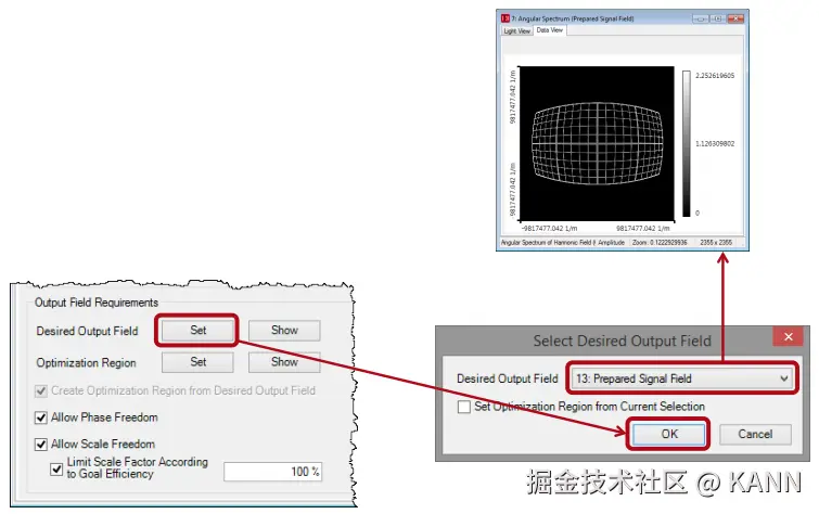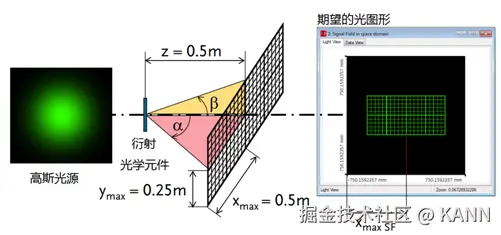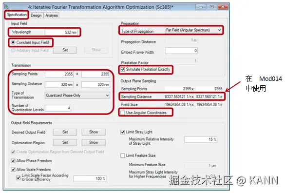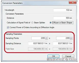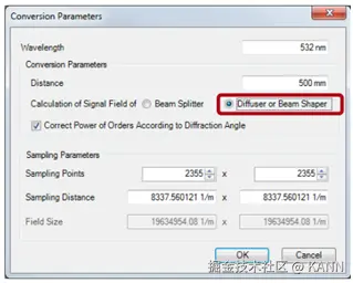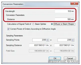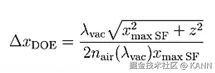 案例385(2.0)关键字:大角度设计,补偿,枕形,桶形,畸变,强度衰减,信号场准备,衍射光学元件,损耗,期望光目标图案,迭代傅里叶变换算法 1. 建模描述 设计扩散器以在远场生成高数值孔径光图案 光源参数:— 高斯光源波长:532nm— 根据最终的衍射光学元件选择合适的直径 系统参数:— 衍射元件到屏幕距离:z=0.5m 输出场要求:— 期望光图案:1.0m×0.5m网格— 光图案期望分辨率:±0.5mm(目标平面上相邻衍射级次间的最小距离:∆xTP=1mm(离轴))— 目标图案来源于文件“Sc385_HighNA_DiffuserDesign_01_DesiredLightPattern.bmp” 衍射光学元件参数:— 衍射元件的相位阶数:4 2. 设计类型与步骤 远场应用优化衍射光学元件用以生成高数值孔径角分布。 信息衍射光学元件在波数域上生成一个角分布(kx,ky)。 设计步骤A. 计算衍射光学元件的像素尺寸、周期和像元数。B. 根据参数计算结果预先设置傅里叶迭代法优化文档。C. 根据靶面上期望的光强分布在波数域上生成一个具有预补偿角的光分布,并作为设计目标图形。可以类似的定义一个特定的优化范围。D. 傅里叶迭代法优化文件的最终设置(定义实际的设计目标图案)。A. 计算1. 根据信号场沿x方向扩展的一个合理的初始值计算衍射光学元件的最小像素(特征)尺寸(此处xmax SF仅有0.75m): 将此值近似到一个可加工尺寸 (∆x’DOE)以兼顾制造者加工过程中对于位置增加以及最小特征尺寸的加工能力。此处近似后,∆x’DOE=320nm。根据该值重新计算对应的x’max SF值。 2. 计算衍射光学元件最大周期 pmax:利用公式 3. 计算衍射光学元件每个周期的像素数#s和近似给出采样点数目#s’。例如#s’=2355 4. 计算可得到的最大衍射角(用’表示) 5. 计算获得的轴上输出光强的分辨率 B. 迭代傅里叶变换方法优化文件的预设置 C. 1 生成预补偿信号场 根据目标平面上给出的空间光强分布,使用模块Mod014在波数域计算一个角谱光强分布。 必须在模块对话框中输入采样距离,采样距离可通过迭代傅里叶变换方法优化文件计算出来并以波数值表示(在迭代傅里叶变换方法文件中不勾选“使用角谱坐标”)。 C. 2 模块设置 设计波长 衍射光学元件与目标平面间距离(需考虑角度要求) C. 3 模块设置 选择扩散器模式 C. 4 模块设置 采样点自动适应选择 采样距离取自傅里叶迭代算法优化文件 视场角以波数坐标形式表示kx,ky C. 5 利用模块补偿 D. 在傅里叶迭代算法优化文档中定义DTP 在IFTA优化文档中,生成的预补偿DTP作为期望输出场。 3. 衍射光学元件设计最终的仿真结果 4. 总结 VirtualLab 软件为用户提供了更便于使用的设计工具,用于设计生成大角度光图形的大数值孔径衍射光学元件。 典型的不希望的效应:— 几何畸变— 强度衰减都可被完全地补偿。 |