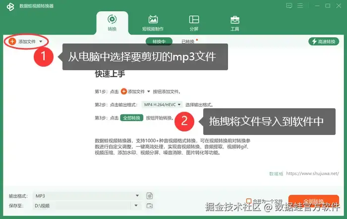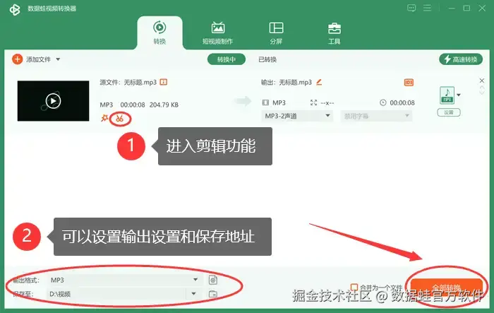 数据 蛙视频转换器是一款优秀的音频切割工具,它支持高清无损的音频剪切,能确保在剪切mp3文件时,音质不受损。在精准剪切的前提下,用户可以根据需求精确选择剪切起始和结束位置,轻松剪辑出所需的部分。在剪辑完毕后,软件的音频处理速度极快,能在短时间内完成剪切任务,提高工作效率。