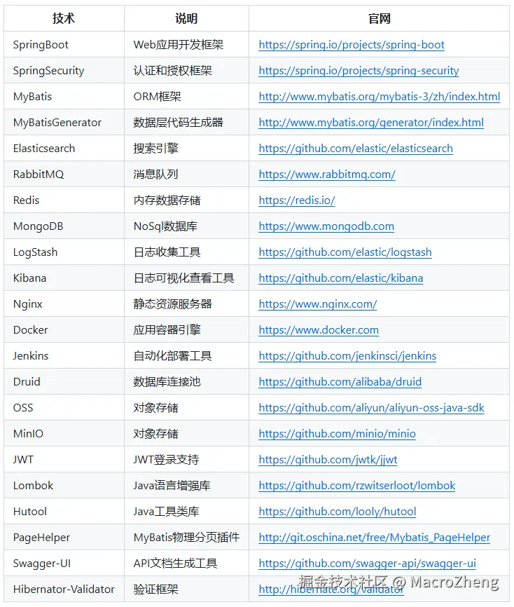 在我们熟悉项目功能之后,就可以开始学习项目对应的技术栈了,一般项目使用的技术栈在文档里面都会有说明,下面是mall项目所使用的技术栈。