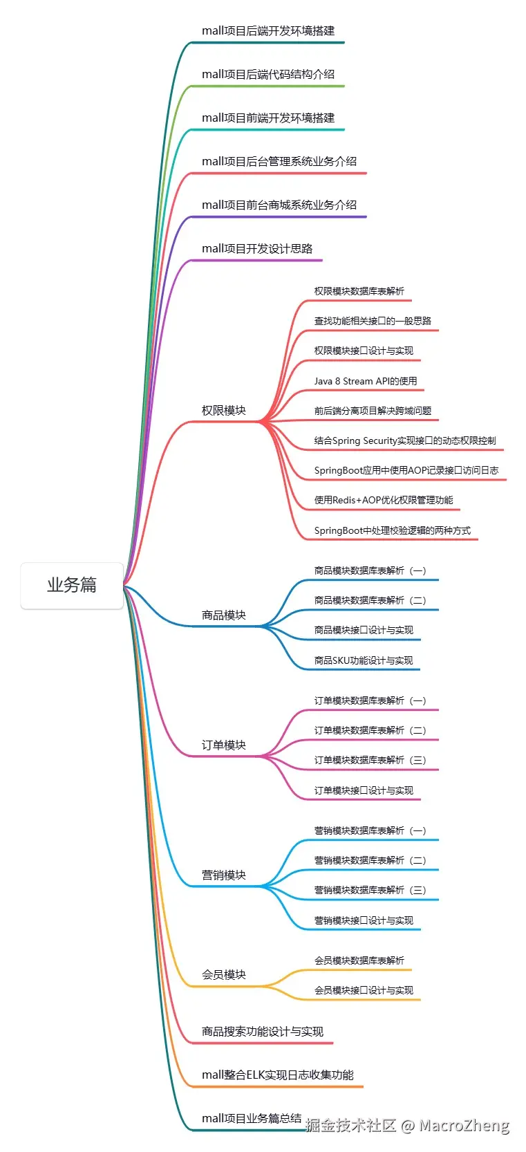 在《mall学习教程》的业务篇中就有mall项目业务的详细讲解,涵盖了权限、商品、订单、营销这些核心模块的业务和技术实现讲解,下面是《mall学习教程》业务篇的目录大家可以参考下。