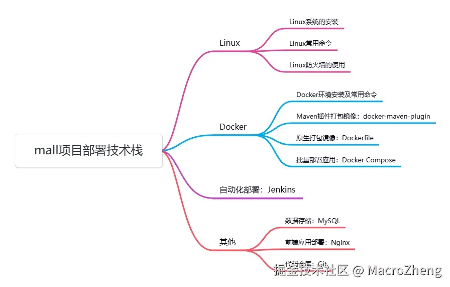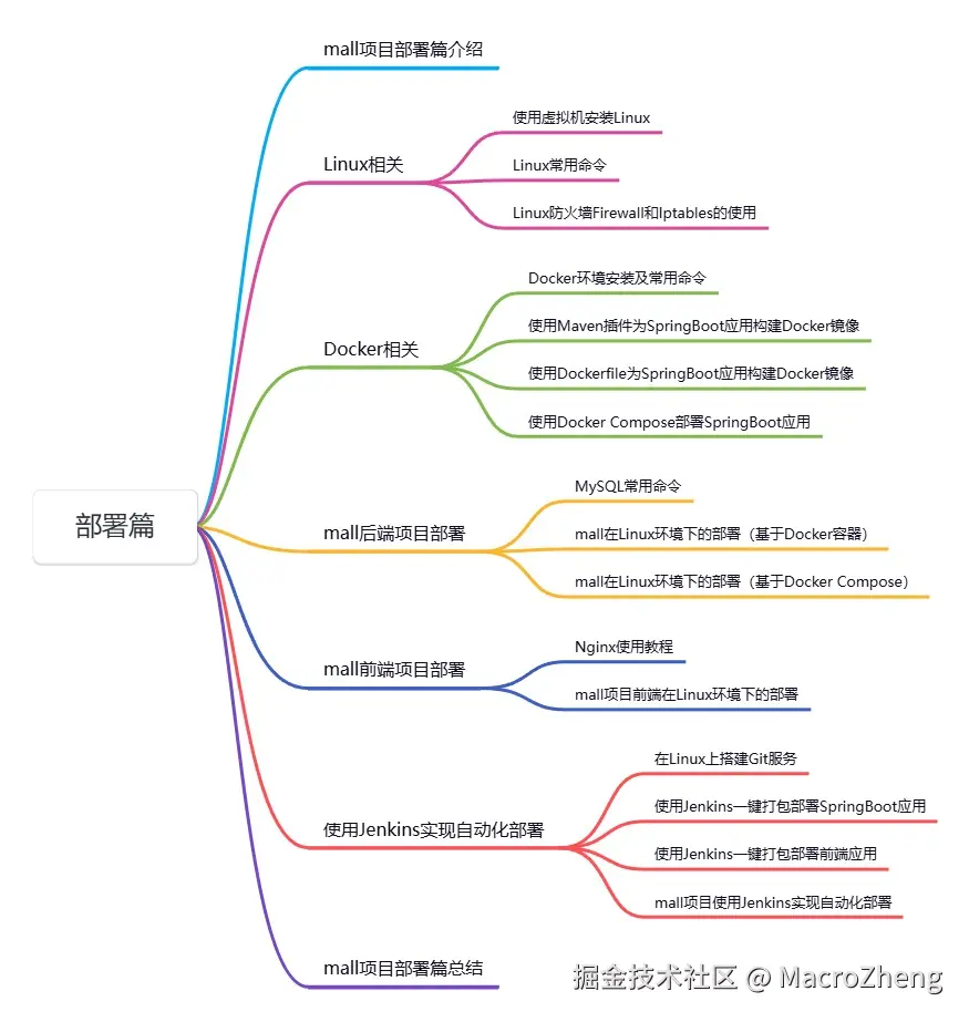 在《mall学习教程》的部署篇就有mall项目部署的详细讲解,涵盖了Linux、Docker、Jenkins的使用及项目的线上部署流程,下面是《mall学习教程》部署篇的目录大家可以参考下。