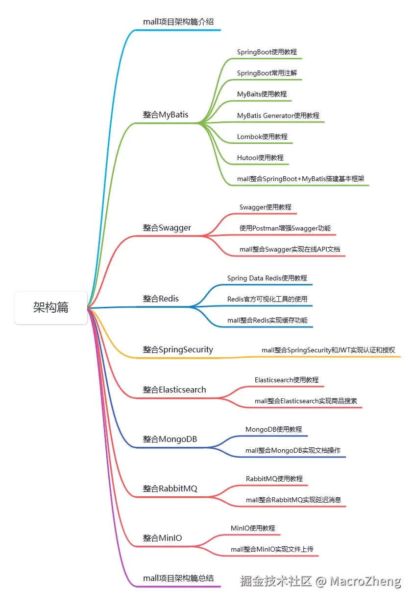 我们可以照着项目的技术栈去学习项目中使用的技术,比如在《mall学习教程》的架构篇中不仅会带你学习mall项目中使用到的每个技术,还会带你搭建一个mall项目在使用的项目脚手架,下面是《mall学习教程》架构篇的目录大家可以参考下。