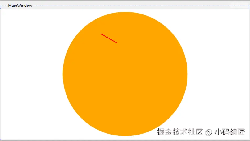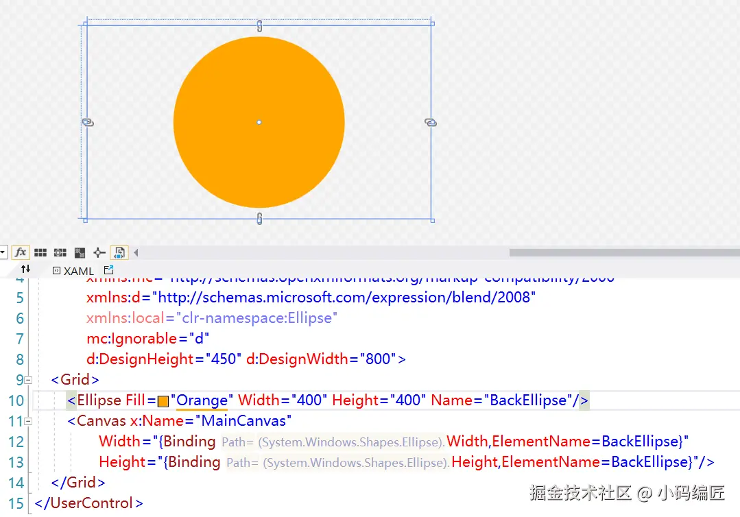 我们先用Ellipse画一个橙色的圆,然后将Canvas的宽度和高度绑定到Ellipse的宽度和高度