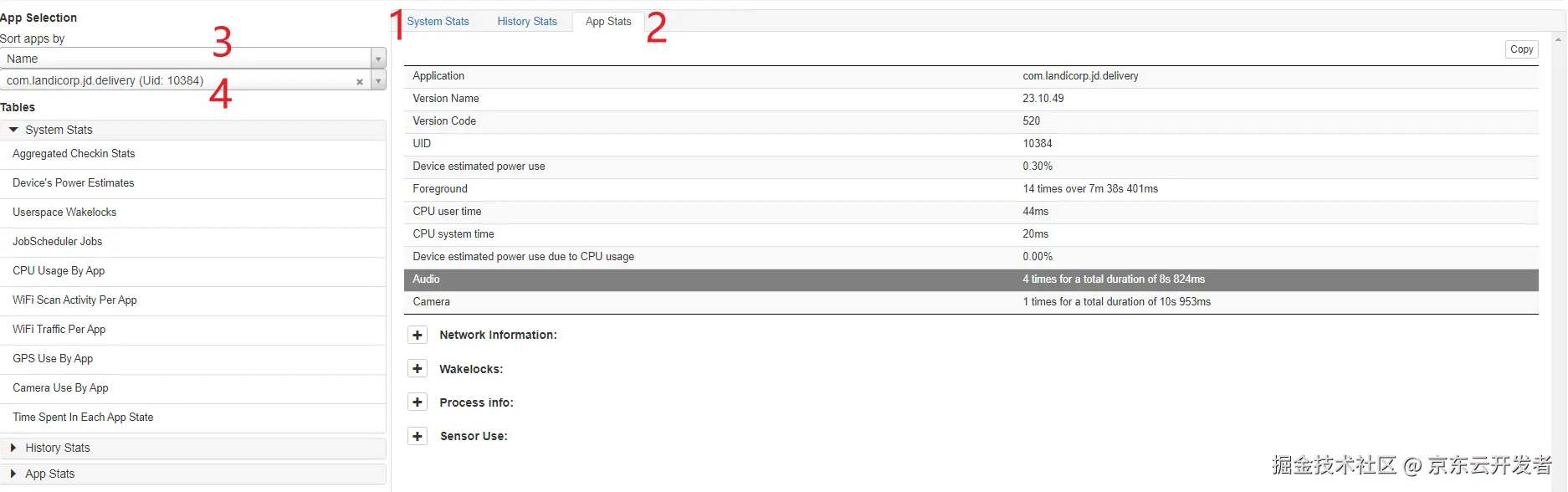 •标号4:在下拉列表中选择指定的App后可以在App Stats中查看具体信息。App Stats所展示的信息都是所选定的App产生的数据,不会收到外部因素的影响