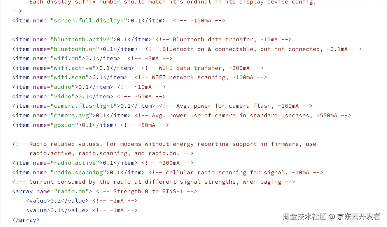 /frameworks/base/core/res/res/xml/power_profile.xml中提供组件的电源配置文件。 如需确定电源配置文件的有关数值,请使用测量设备耗电量的硬件,并执行需要其耗电量信息的各种操作。测量执行这些操作时的电量使用情况并计算各项值(在适当情况下与其他基准操作的电量消耗做对比所得的差异值)。 电源配置文件的目的在于适当地估算电量消耗情况,电源配置文件的有关数值以电流(安培)表示。Android 框架用电流乘以子系统处于激活状态的时间,并计算毫安时值,然后将此值用于评估应用/子系统消耗的电池电量。
