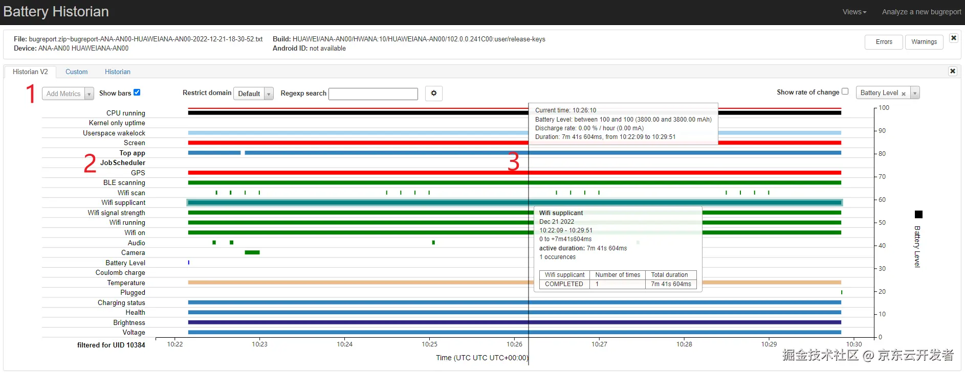 •标号3:将鼠标悬停在某个条目上可以查看该指标的更多详细信息,以及时间线上特定定的耗电量