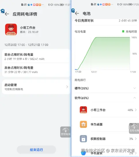 厂商提供的耗电排行也可以用来查看一端时间内的应用耗电情况。比如华为的耗电排行中,对硬件和软件耗电进行了拆分了,并给出每个应用的具体耗电量