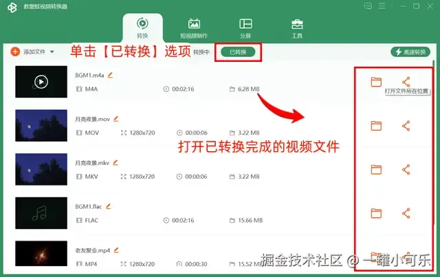 第三步:单击【已转换】选项,查看转换完成的任务列表,单击文件夹图标,打开已转换完成的视频文件。