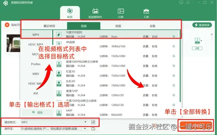 第二步:选择【输出格式】选项,在视频格式列表中,选择目标格式,然后单击【全部转换】。