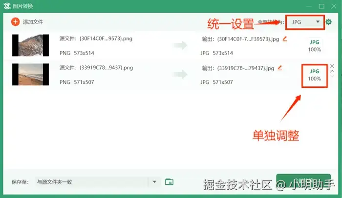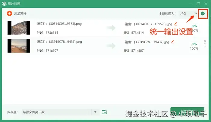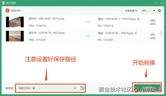 第四步: 注意设置好自己需要的文件保存位置。确认所有设置无误后,点击【全部转换】。稍等一会儿,图片转换就完成啦。
