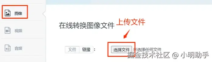 第三步: 点击界面左侧的【图像】按钮,点击【选择文件】,选择需要转换的图片进行上传。
