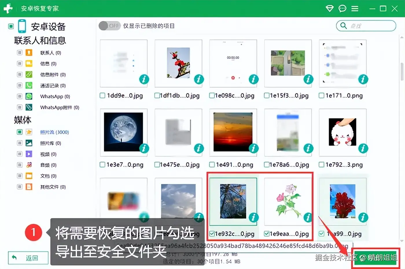 步骤3:开启恢复。扫描完成后,软件界面会展示所有找到的照片文件。将需要恢复的图片选中,确认无误后,点击 【导出】 按钮,软件会将选定的照片保存到电脑上。