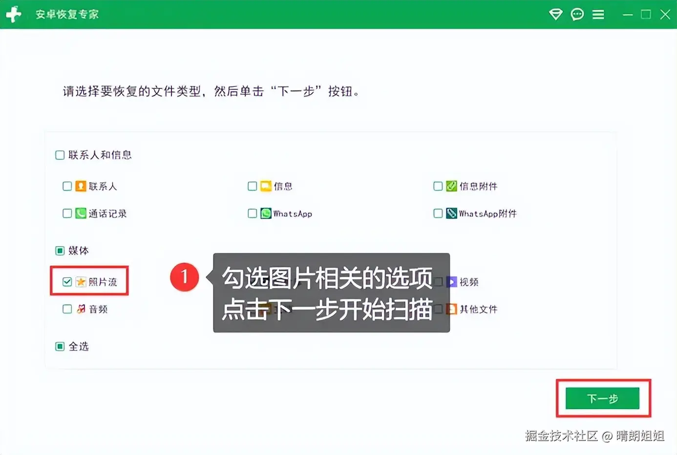 步骤2:扫描照片。在软件界面中选择 【照片流】 作为要恢复的文件类型,接着,软件将开始对你的手机进行深度扫描。