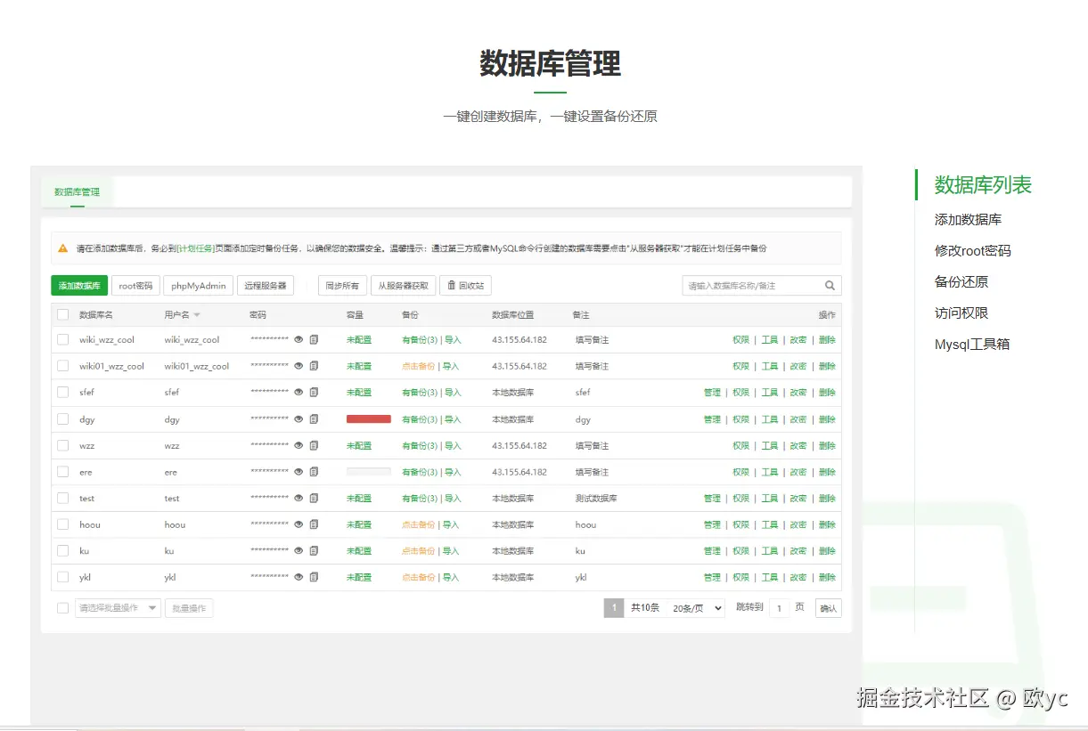 数据库管理:涵盖了主流的数据库类型,如 MySQL、MariaDB 等,能够方便地进行数据库的创建、用户权限设置以及数据导入导出等操作,极大地简化了数据库管理流程。