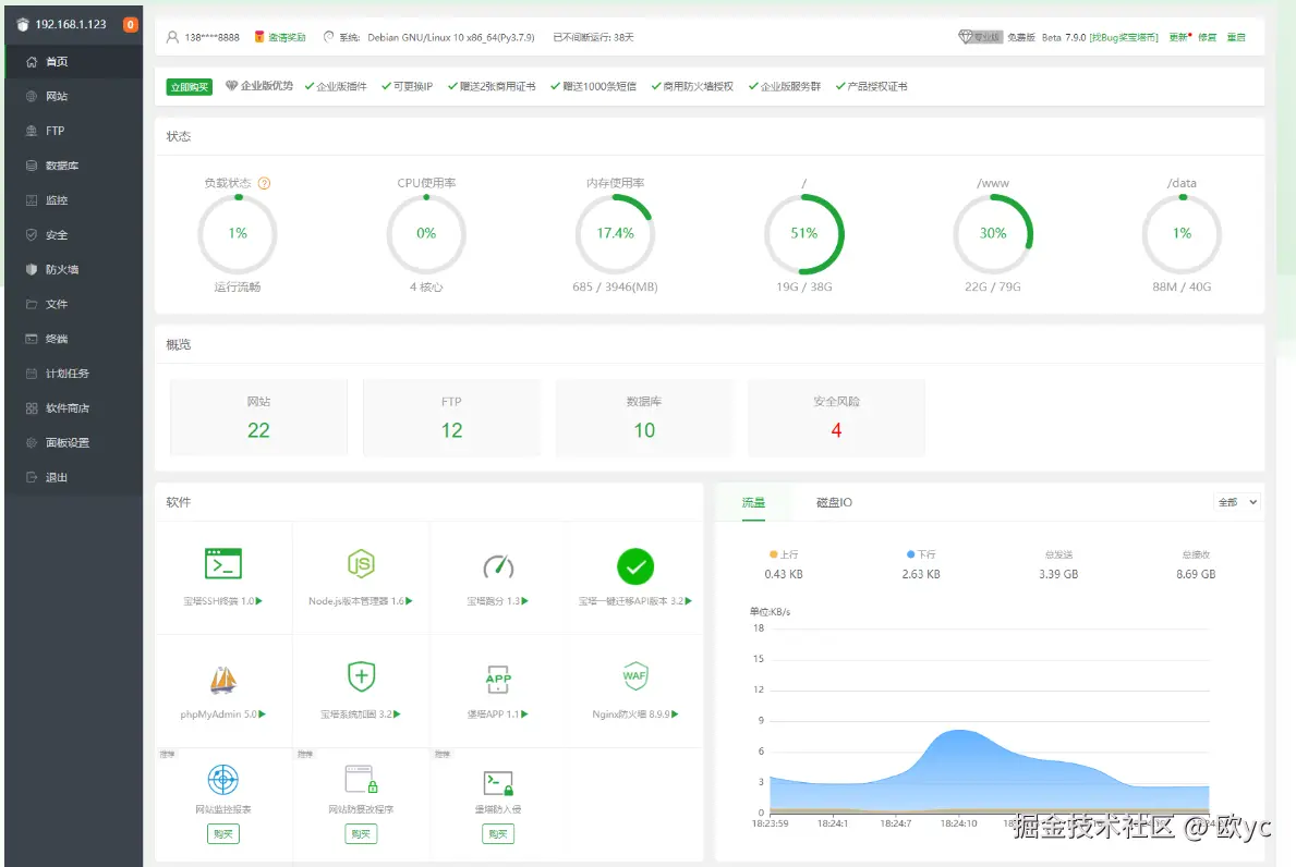 宝塔面板是一款广为人知且在国内使用非常普遍的 Linux 服务器管理面板。它拥有简洁直观的操作界面,对于新手用户来说十分友好,能够让没有深厚技术背景的人员也较为轻松地进行服务器的各种基础管理操作,比如网站搭建、数据库管理、FTP 管理等。
