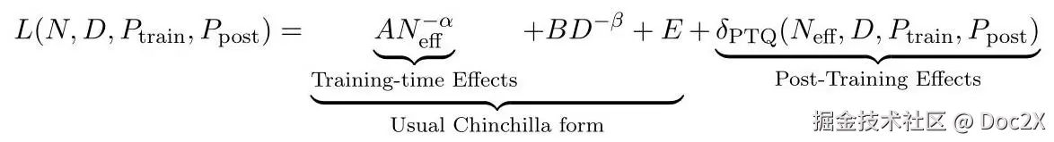 符号说明。全文中,表示数据集大小(以标记为单位),表示模型大小(以参数为单位)。指的是在训练期间权重、激活和键值缓存(“注意力”)的位精度(整数类型),指的是我们在模型推理结束时对权重进行后训练量化(PTQ)的精度。当或使用时未指明模型的某部分,则所有三个模型部分都绑定到相同的精度。由后训练量化引起的推理时损失退化将表示为,其定义为与预训练结束时相比进行后训练量化所引起的损失变化。我们使用“高精度”来指代16位或以上。