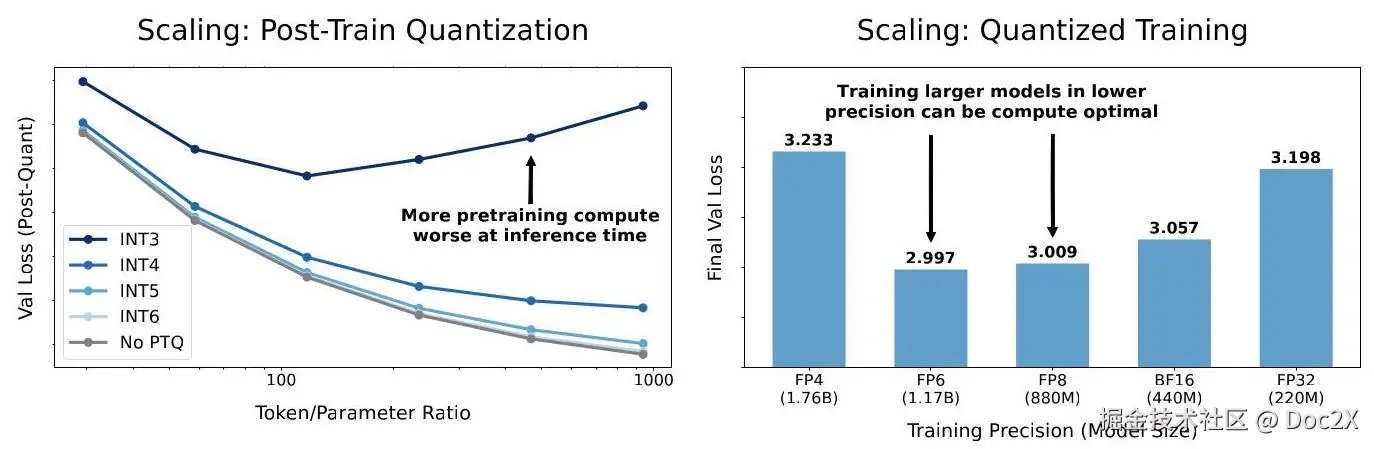 图1:关键发现的示意图。(左)在BF16中训练固定模型大小到不同的数据预算,并在最后进行权重量化。我们发现,由于后训练量化导致的退化随着预训练期间看到的标记数量增加而增加,以至于最终额外的预训练数据可能是有害的。(右)我们的扩展建议根据第4.3节中的成本模型,在较低精度下训练更大的模型可能是计算最优的。权重、激活、注意力均被量化,所有模型均在相同的数据预算上训练,详细信息见附录H。