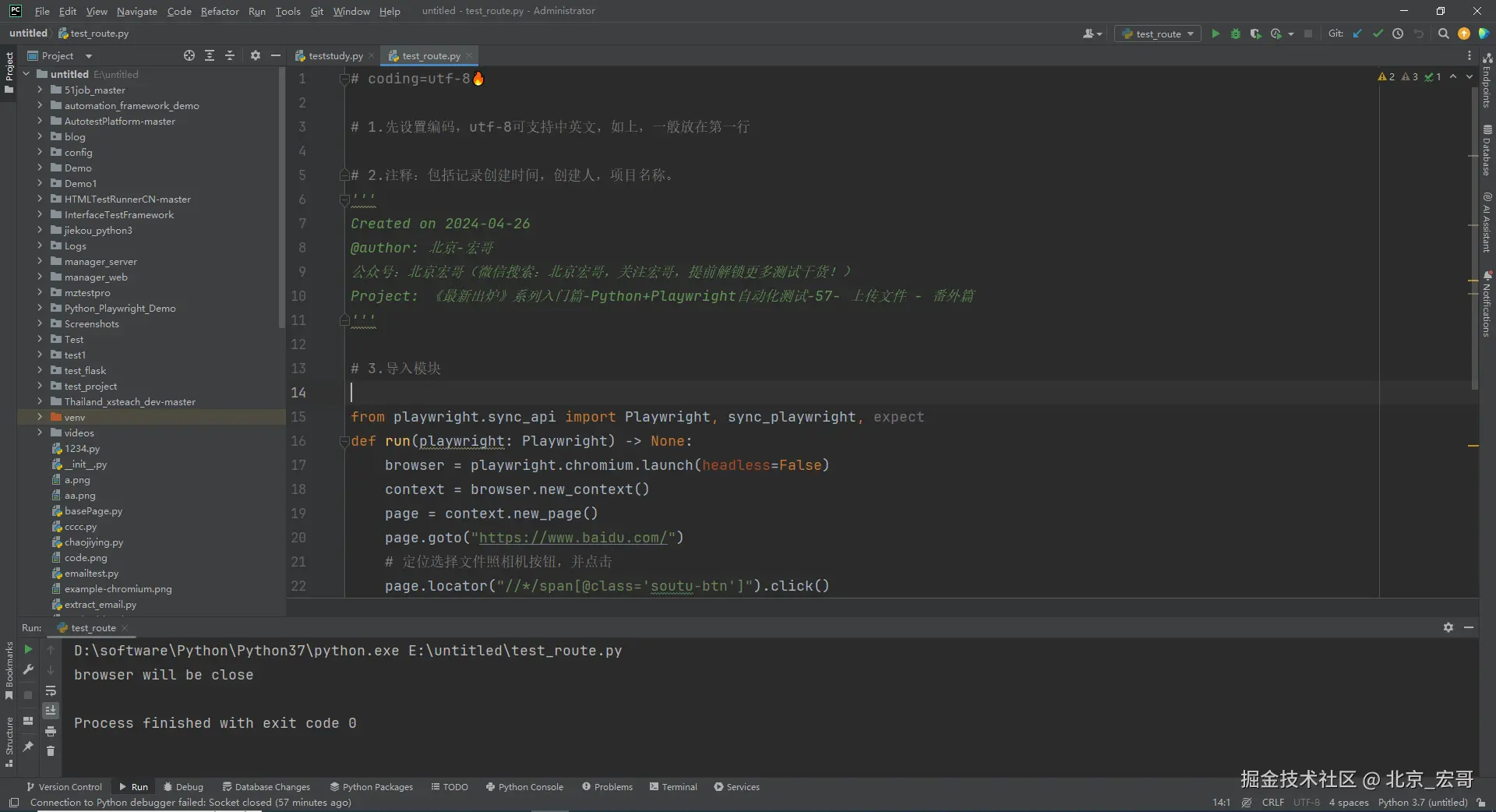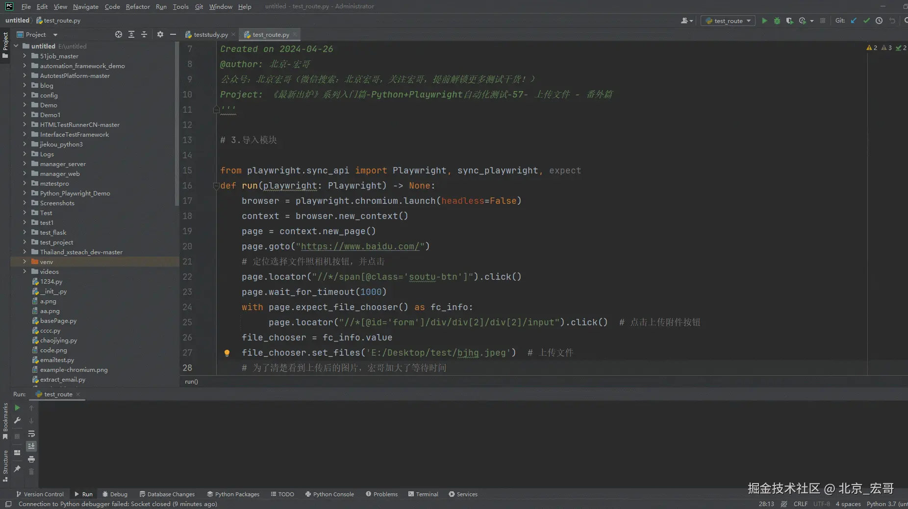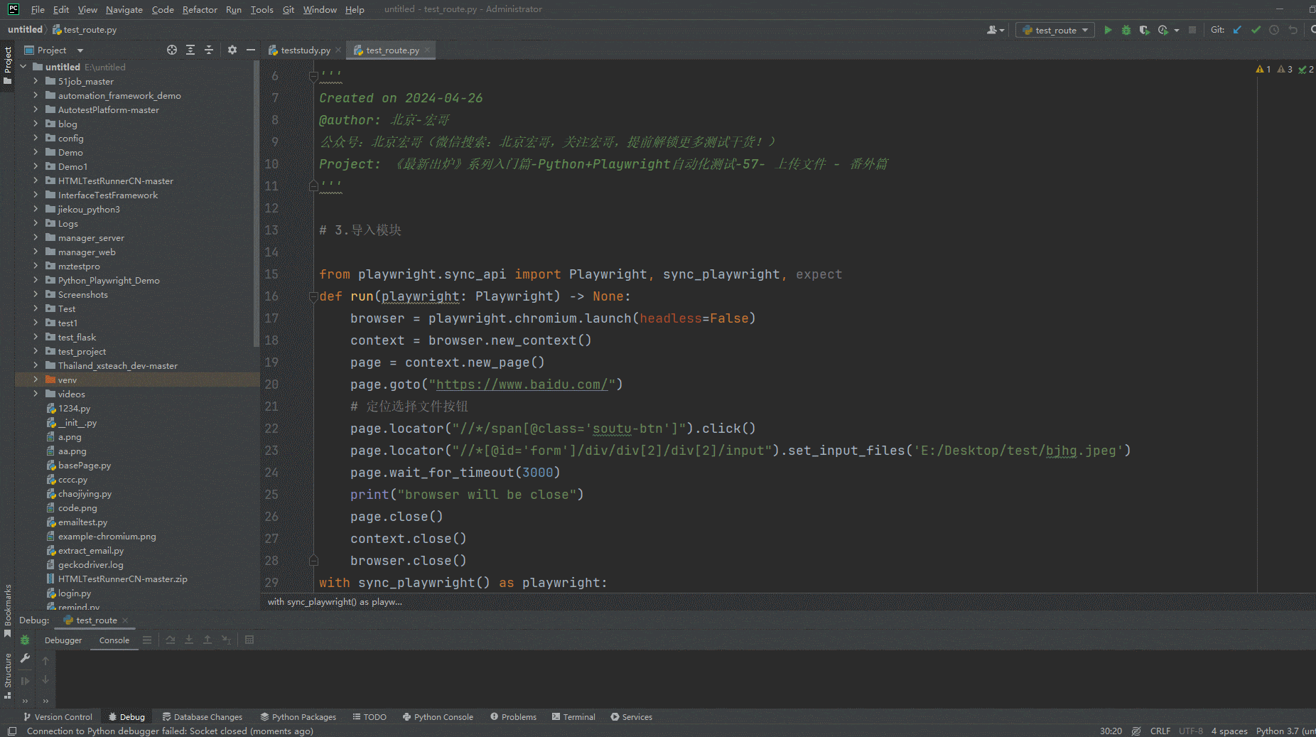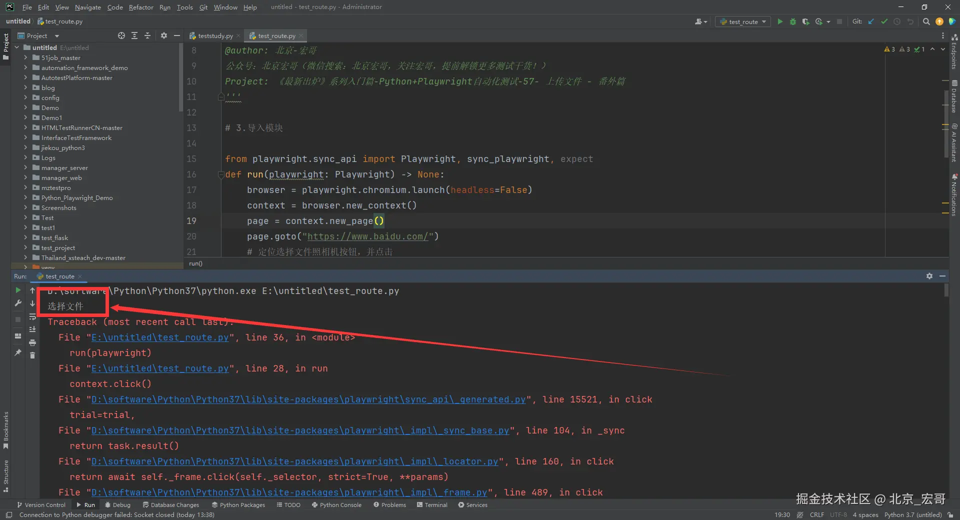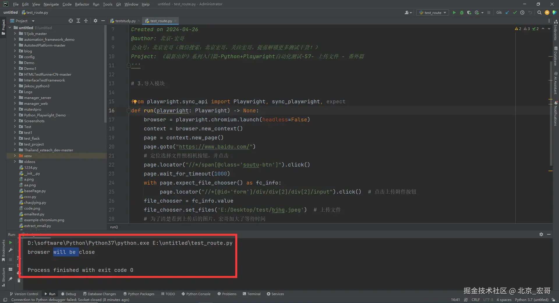 这一篇主要是介绍一下宏哥在文件上传的实践过程中遇到的一个小插曲,以及为啥会出现这个小插曲的原因。其实搞明白了也很简单的。 好了,今天时间也不早了,宏哥就讲解和分享到这里,感谢您耐心的阅读,希望对您有所帮助。下一篇介绍文件下载。