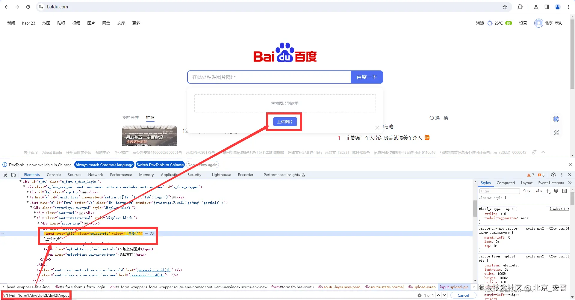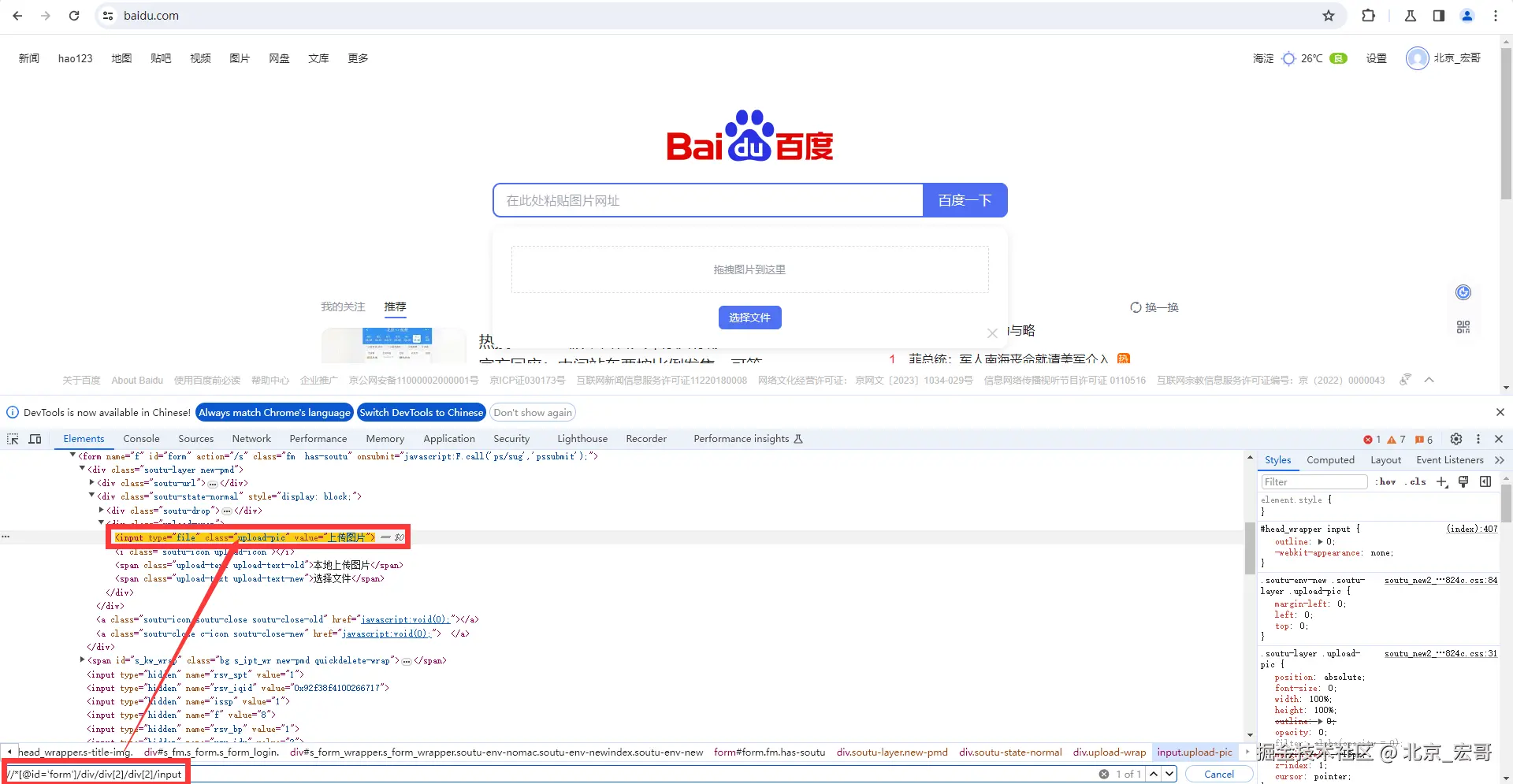 打开百度首页,搜索按钮左侧有一个照相机的图标,点击可以选择图片搜索,我们通过本地上传图片的过程来模拟文件自动化上传操作,上传成功后,百度识图会识别是不是百度搜索的图片,如果是,就会显示图片的信息,如果不是,就会识别失败,提示重新上传。准备条件,你在百度图片搜索一个图片,保存到你桌面,例如宏哥找到一个关于selenium的图片,然后保存在桌面的test文件夹,名称为北京宏哥的拼音首字母:bjhg.jpeg。首先宏哥按我们常规思路:非input控件上传文件。