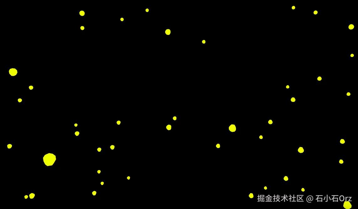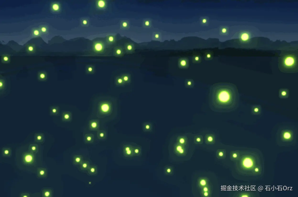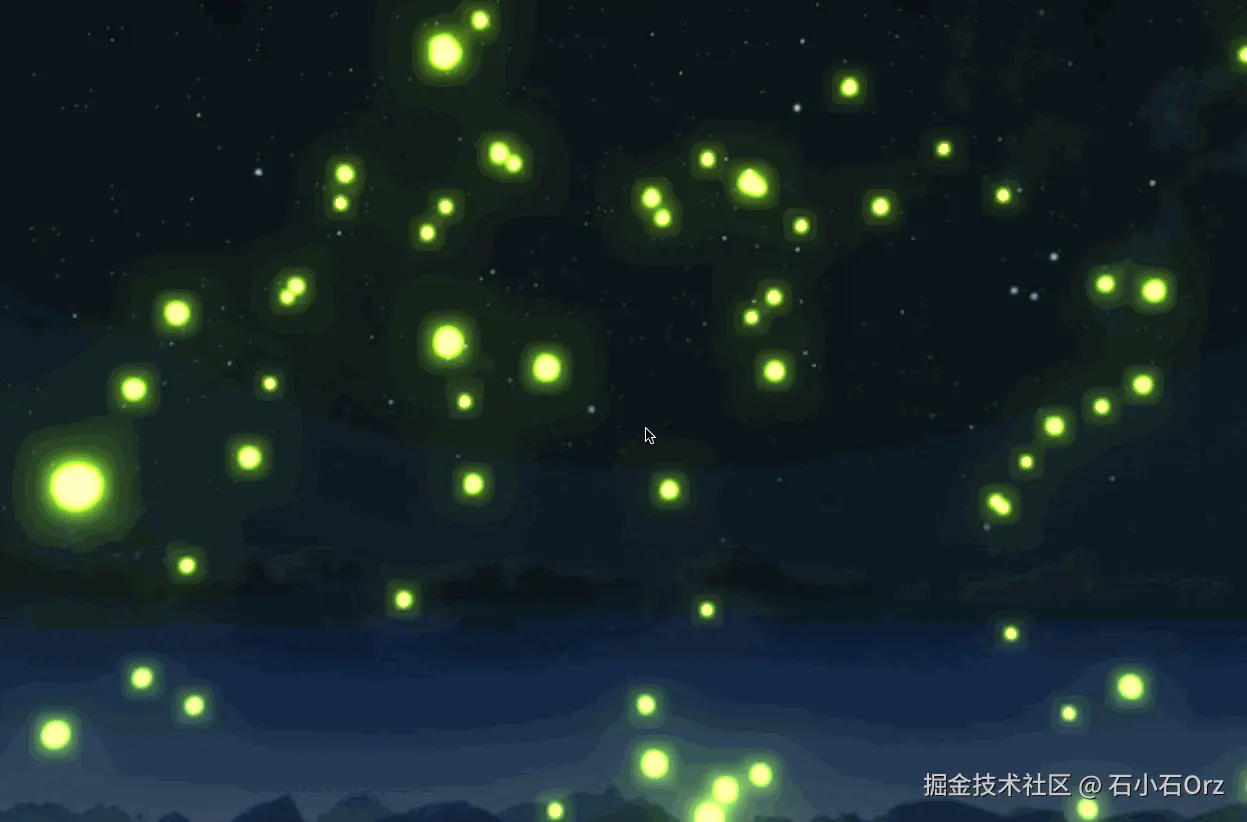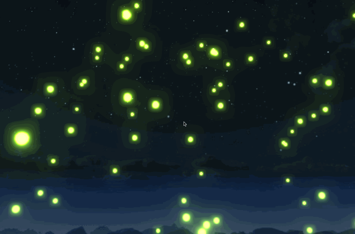simplex-noise库生成的噪声数据,控制每个粒子的运动轨迹,模拟萤火虫自然飞舞的效果。 - 场景优化:添加了背景图片,模拟夜空效果;并通过