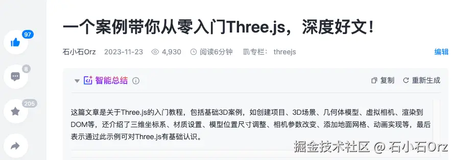 本文核心是探讨AI算法在Threejs中的应用,不会着重介绍Threejs的使用。如果你对Threejs不熟悉或者有遗忘,可以参考我的其他文章复习threejs的基础知识。