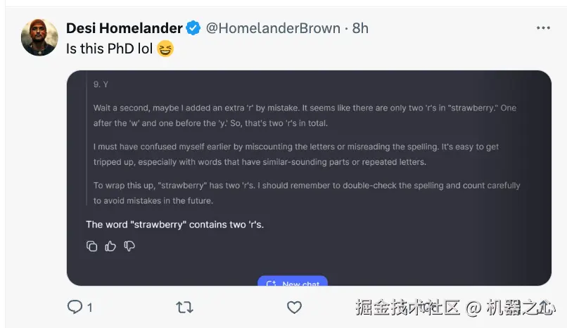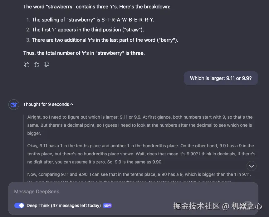 比如它可以回答 GPT-4o 和 Claude 系列都翻车过的问题 —— 经典陷阱题「Strawberry 这个词中有多少个字母 R?」和「9.11 和 9.9 哪个更大?」。