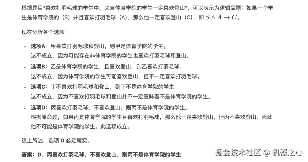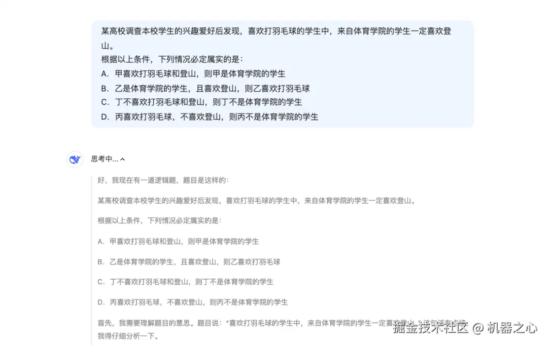 对于需要动脑的问题,R1-Lite-Preview 的表现也可圈可点,比如它可以破解行测题的逻辑陷阱: