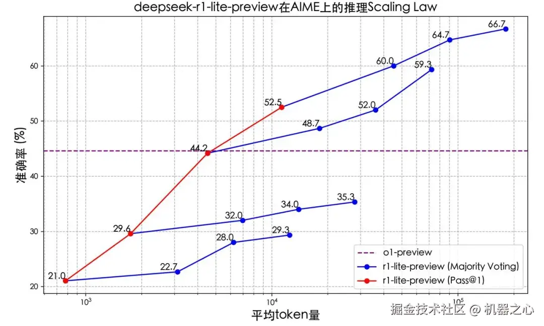 对于用户的 Prompt,DeepSeek-R1-Lite-Preview 会有一个很长的推理过程。如上图中的红色实线所示,模型所能达到的准确率与所给定的推理长度呈正相关。且相比于传统的多次采样 + 投票(Majority Voting),模型思维链长度增加展现出了更高的效率。