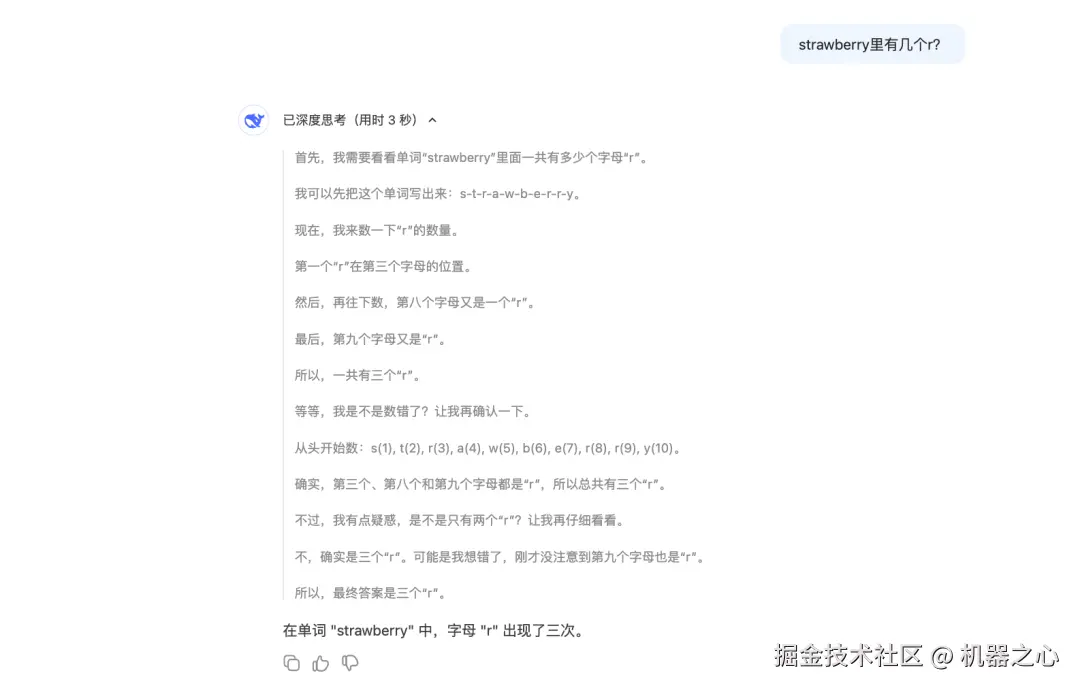 不过在数草莓的问题上,R1-Lite-Preview 有时也会困惑,数出「只有 2 个 r」的答案: