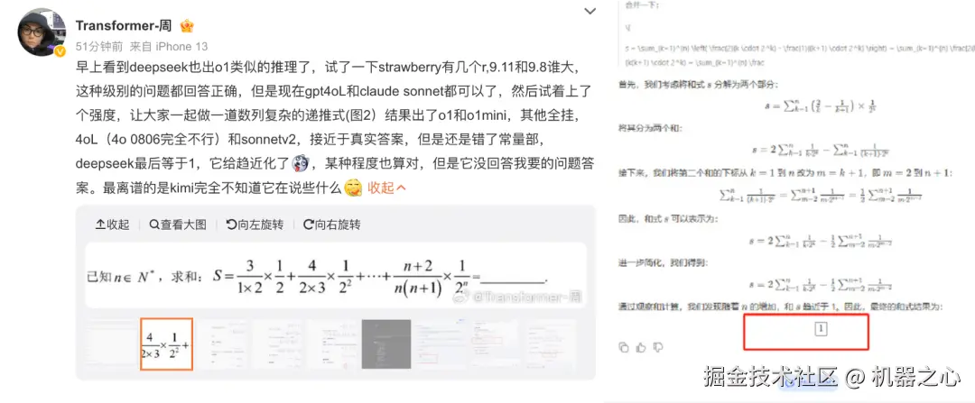 比如科技博主 @Transformer - 周问了一道中学水平的数列题,只有 o1 和 o1mini 做对了,R1-Lite-Preview 没想出关键的破题思路,而是「蒙」出了答案。