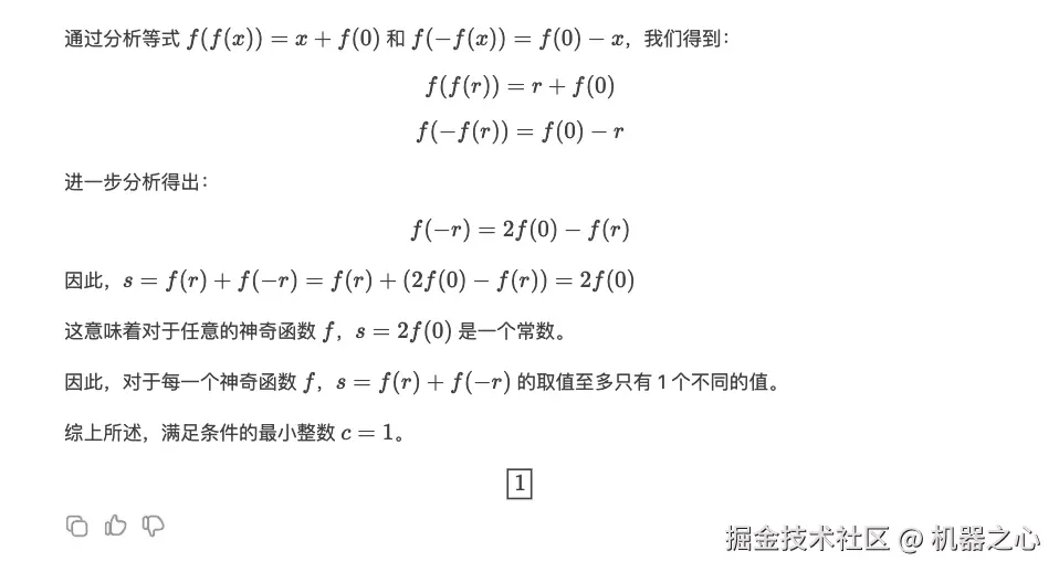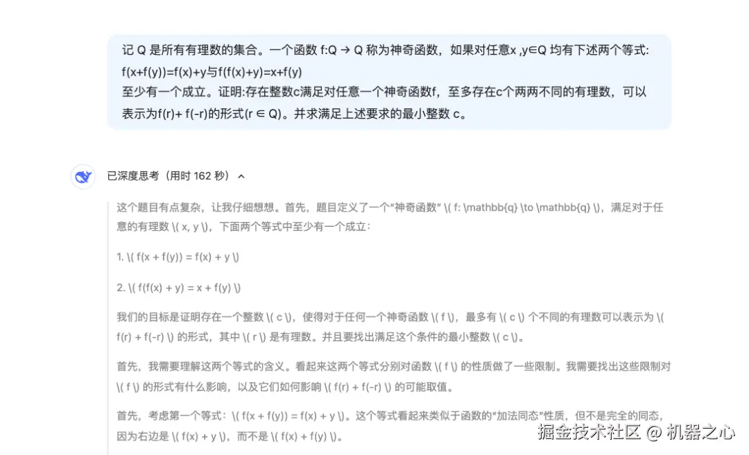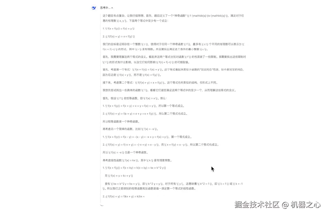 这道代数题相当难,全球仅有 5 个人全对。在长达 162 秒的思考过程中,R1-Lite-Preview 洋洋洒洒地把解题思路写成了一篇小论文,可能它的老师也教过 —— 把解题过程写上能得一半分。