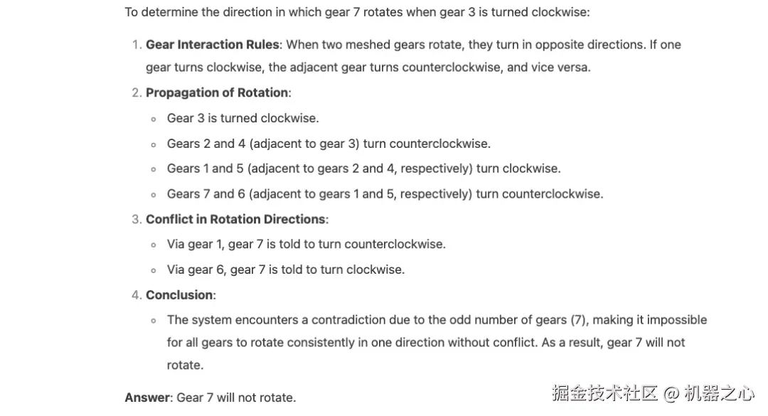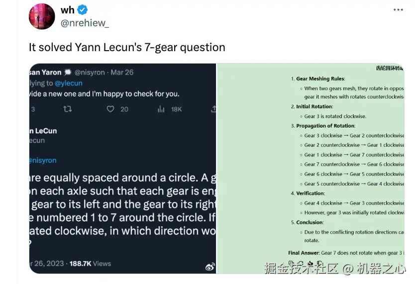 由 LeCun 提出的物理题:圆周上均匀分布了 7 根轴,每根轴上都有一个齿轮。每个齿轮都与其左边和右边的齿轮啮合。齿轮从 1 到 7 编号,依次沿圆周排列。问题是:如果齿轮 3 顺时针旋转,问齿轮 7 会沿什么方向旋转?