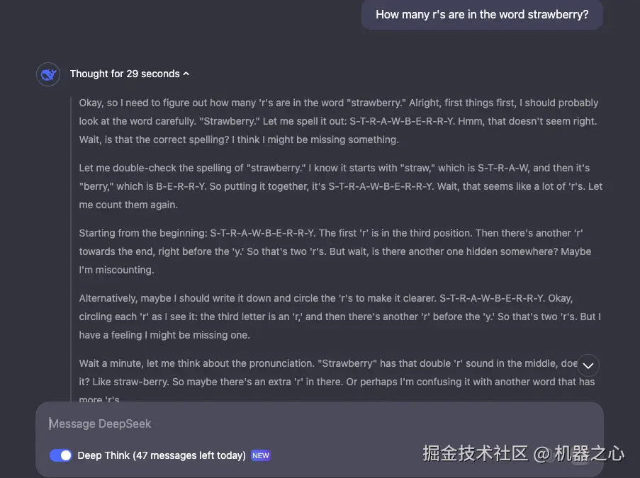 Strawberry 这个词中有多少个字母 R?用时 29 秒。