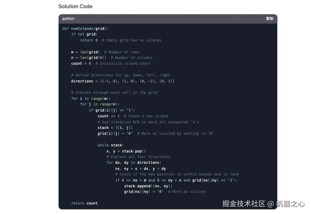 至于 R1-Lite-Preview 被全球顶级编程竞赛(codeforces)等权威评测检验过的代码能力,让它手撕大厂秋招级别的 Leetcode 经典题「岛屿问题」试一下: