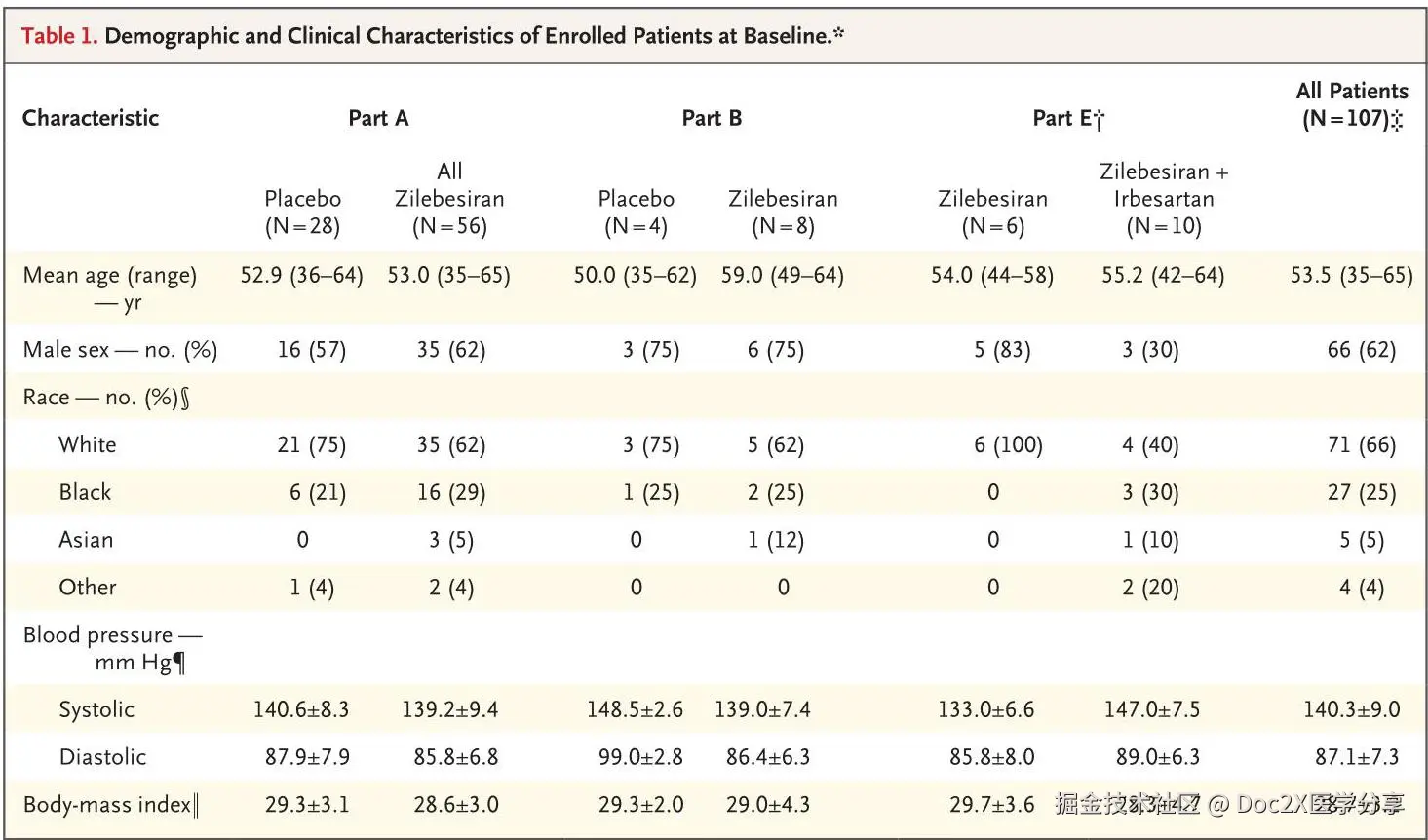 从2019年5月30日到2022年1月26日,共有107名患者入组,其中A部分有84名患者(56名分配到zilebesiran,28名分配到安慰剂),B部分有12名患者(8名分配到zilebesiran,4名分配到安慰剂),E部分有16名患者,其中5名患者之前参与了A部分并仅接受了安慰剂。患者在基线的特征根据研究部分和研究组分配在表1中总结。