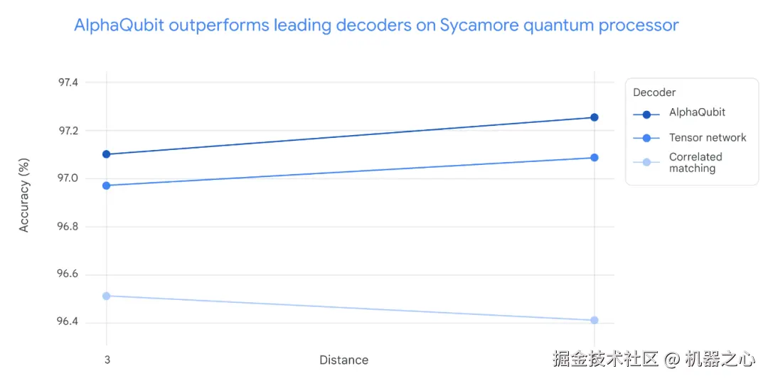 结果显示,AlphaQubit 的性能优于现有的主要算法解码器,表明其在未来中型量子设备上也将具备良好的适用性。