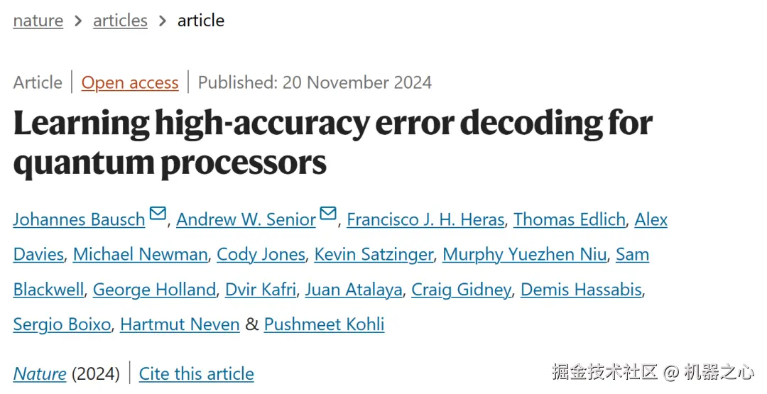 Nature 论文的标题为《Learning High-accuracy Error Decoding for Quantum Processors》,即《学习量子处理器的高准确性错误解码》。